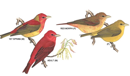 summer tanager Published October 6, 2015 at 552 × 323 in summer tanager Summer Tanager in all plumages: adult male, adult female, immature male and immature female. From the internet.
